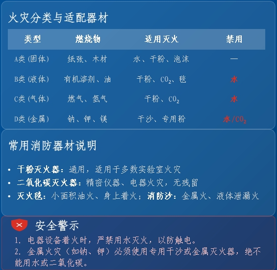 (4)金属(钠 / 钾)着火:只用干沙覆盖,严禁水 / CO₂;
